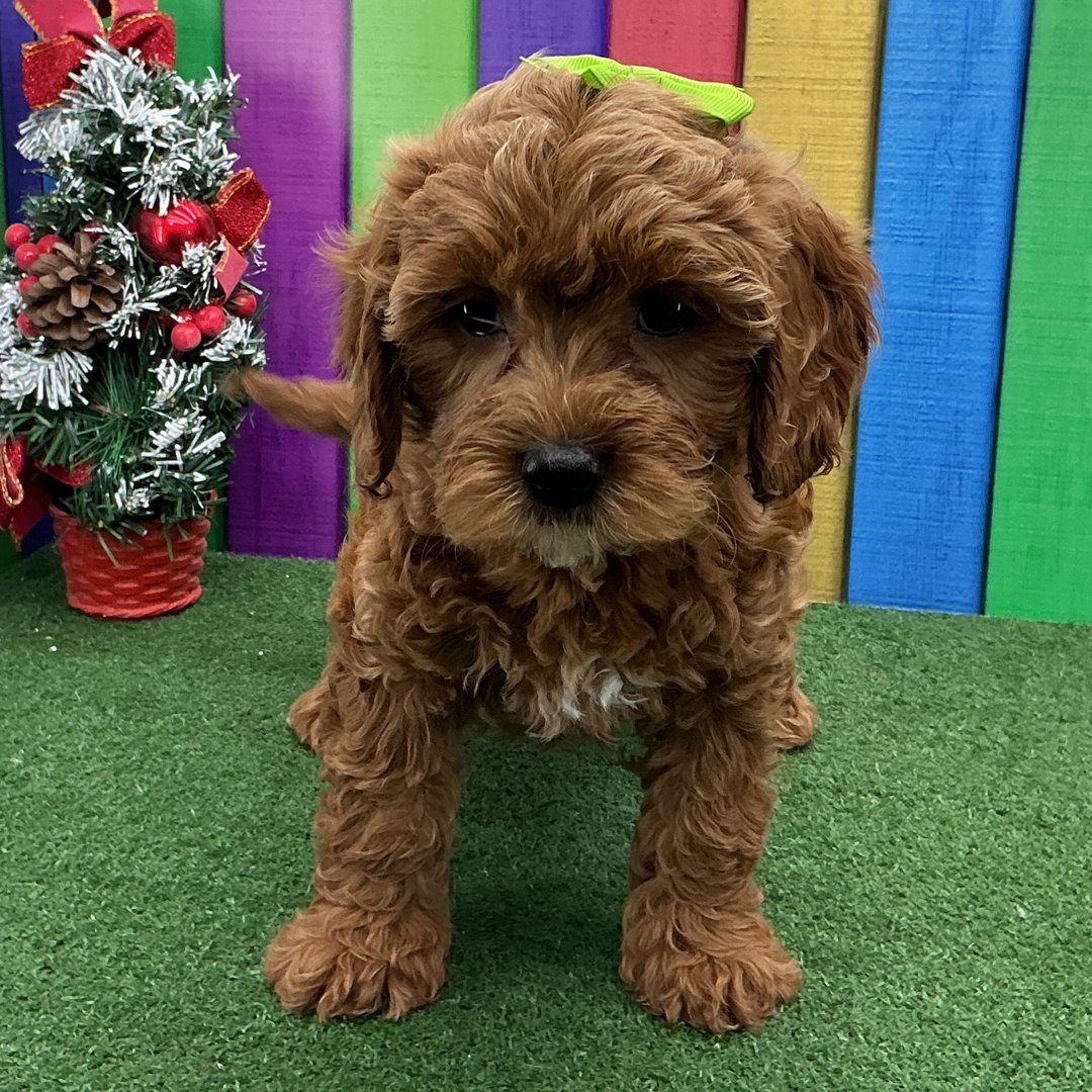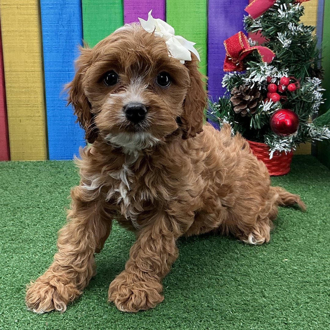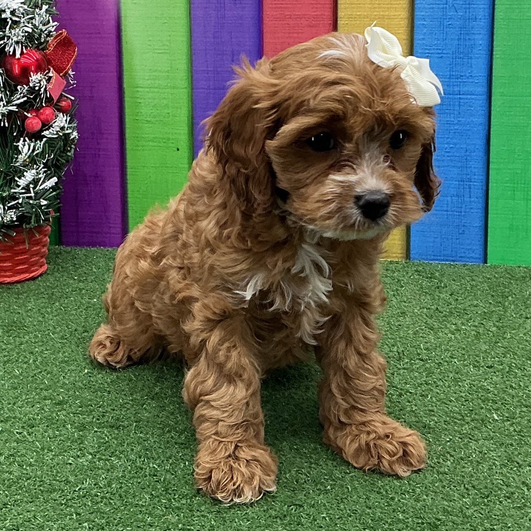 Cavapoodle For Sale | Hi, I’m Jera! I’m a 9-week-old female Cavapoo. My dad is a Cavalier King Charles Spaniel and my mom is a Poodle. I have a beautiful red coat. I am ready now to plan my trip to my forever family. Once I reach my adult size, I’m expected to weigh between 12–20 lbs. I’m ready to be your best friend and cuddle buddy for life.
