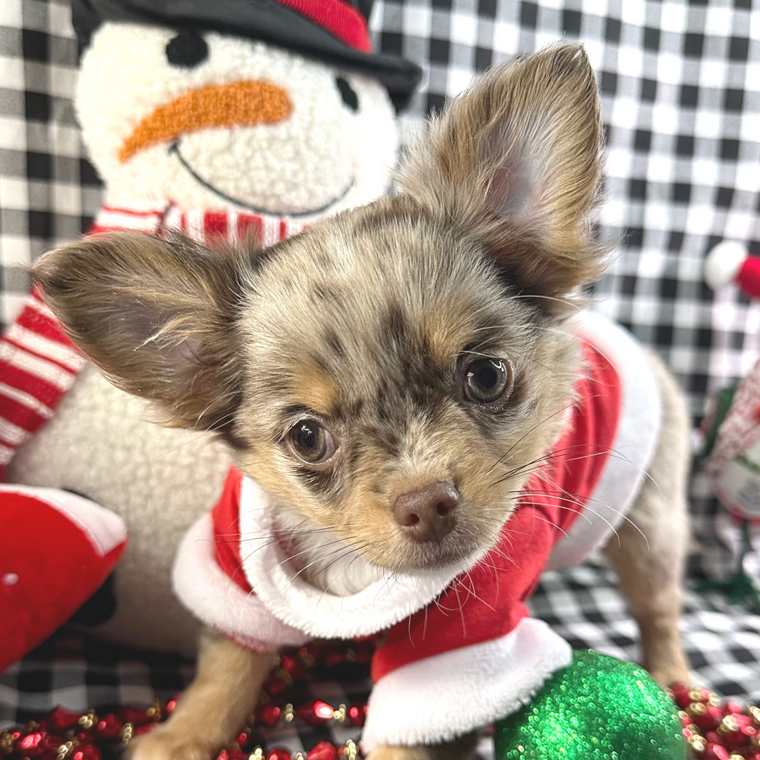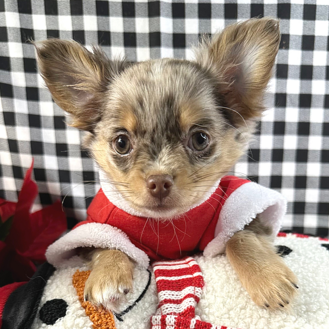 Apple Head Chihuahua Puppies For Sale | Hi, I’m Oleander! I’m a 11-week-old male Chihuahua with a beautiful chocolate merle coat, I am ready now to plan my trip to my forever family. Once I reach my adult size, I’m expected to weigh between 4.5–6 lbs. I’m AKC registered. I will fill your home with love and my wagging tail. Apple Head Chihuahua Puppies For Sale
